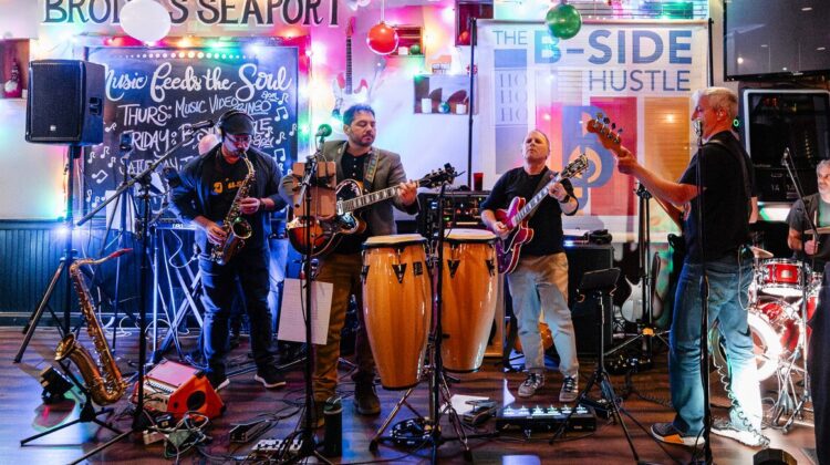 The B-Side Hustle, comprised of Sacha Bodner, Michael Bourne, Jay Mahler, Michael McClung, Jesse Piascik, and Michael Smerka, performs at Brodie’s Seaport in Salem on a Friday night.