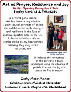 Marblehead Artist, Cathy Marie Michael, invites you to the Opening Reception of her First Solo Art Show on Sunday, Nov. 2 from 12-2 p.m. at the Unitarian Universalist Church at 28 Mugford St. in Old Town, Marblehead.